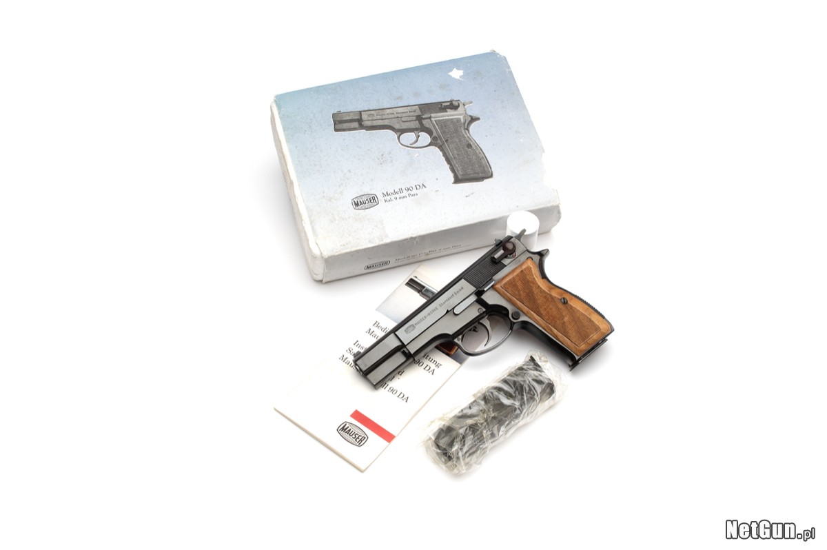 Pistolet samopowtarzalny centralnego zapłonu Mauser Mod. 90DA, kal. 9x19. Kopia legendarnego pistoletu FN High Power, którego ogromna popularność i brak obwarowań patentowych skłoniła firmę FEG do zawojowania rynków zachodnich. Produkowany pod własną marką oraz marką Mauser, pistolet był dużym sukcesem sprzedażowym, o którym zdecydowała wysoka jakość wykonania i niewygórowana cena. Wersja z przeprojektowanym mechanizmem spustowo-uderzeniowym umożliwiającym samonapinanie.