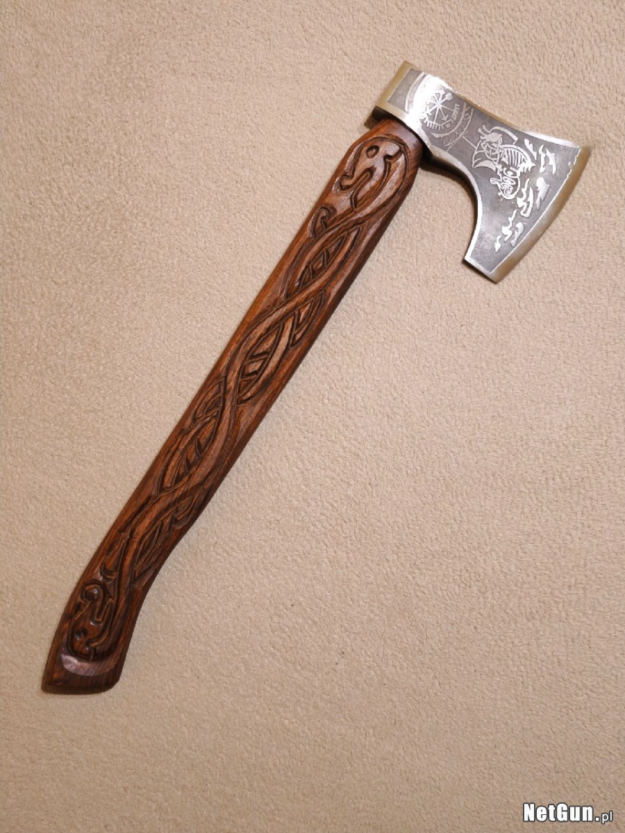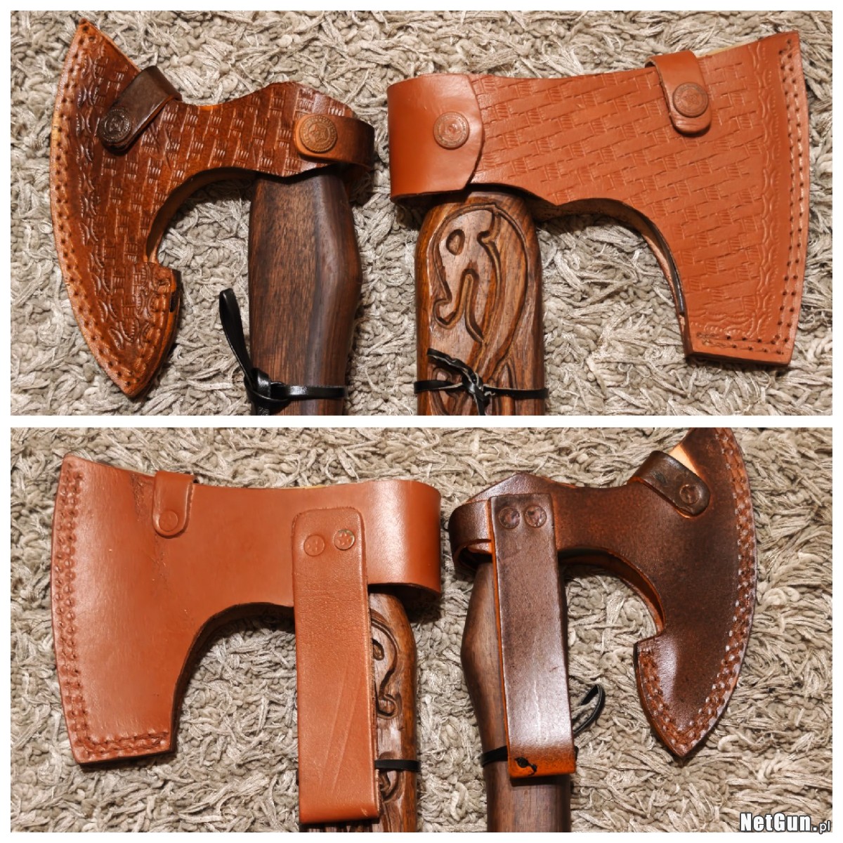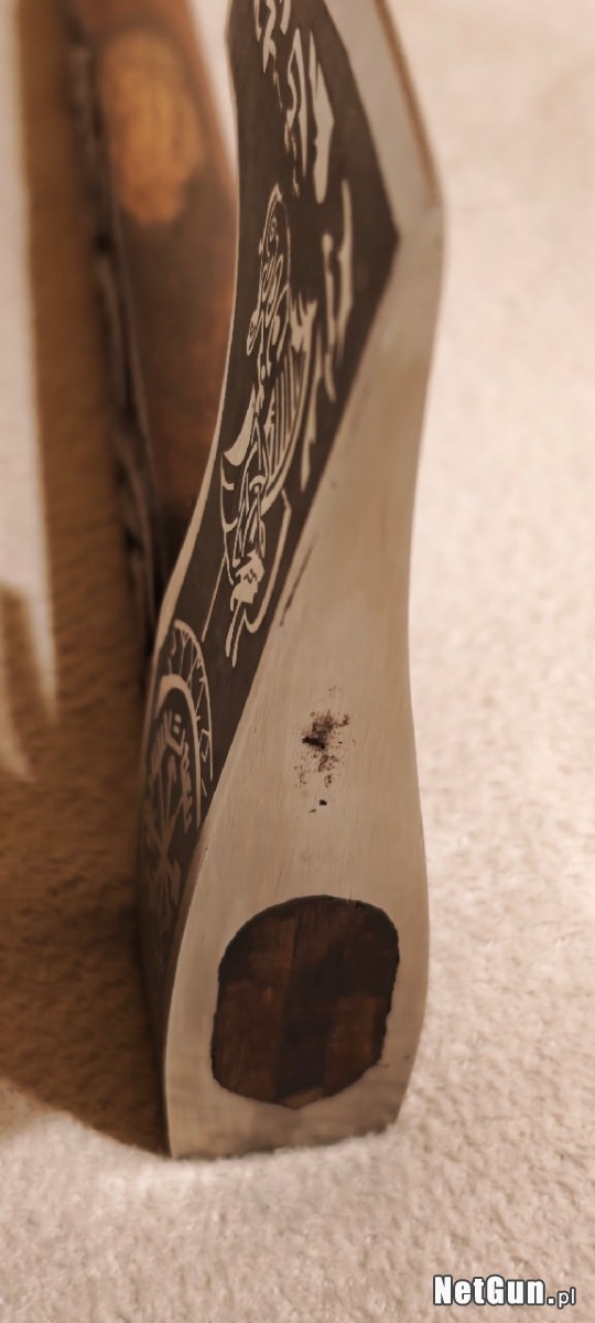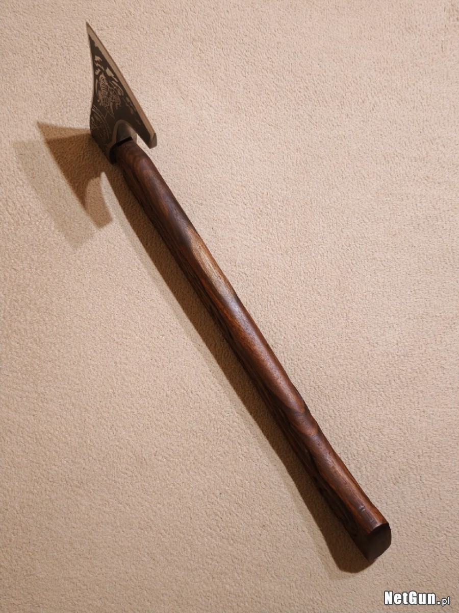 Siekiera posiada ergonomiczną rękojeść wykonaną z drewna, ręcznie rzeźbioną. Która ma właściwości antypoślizgowe.