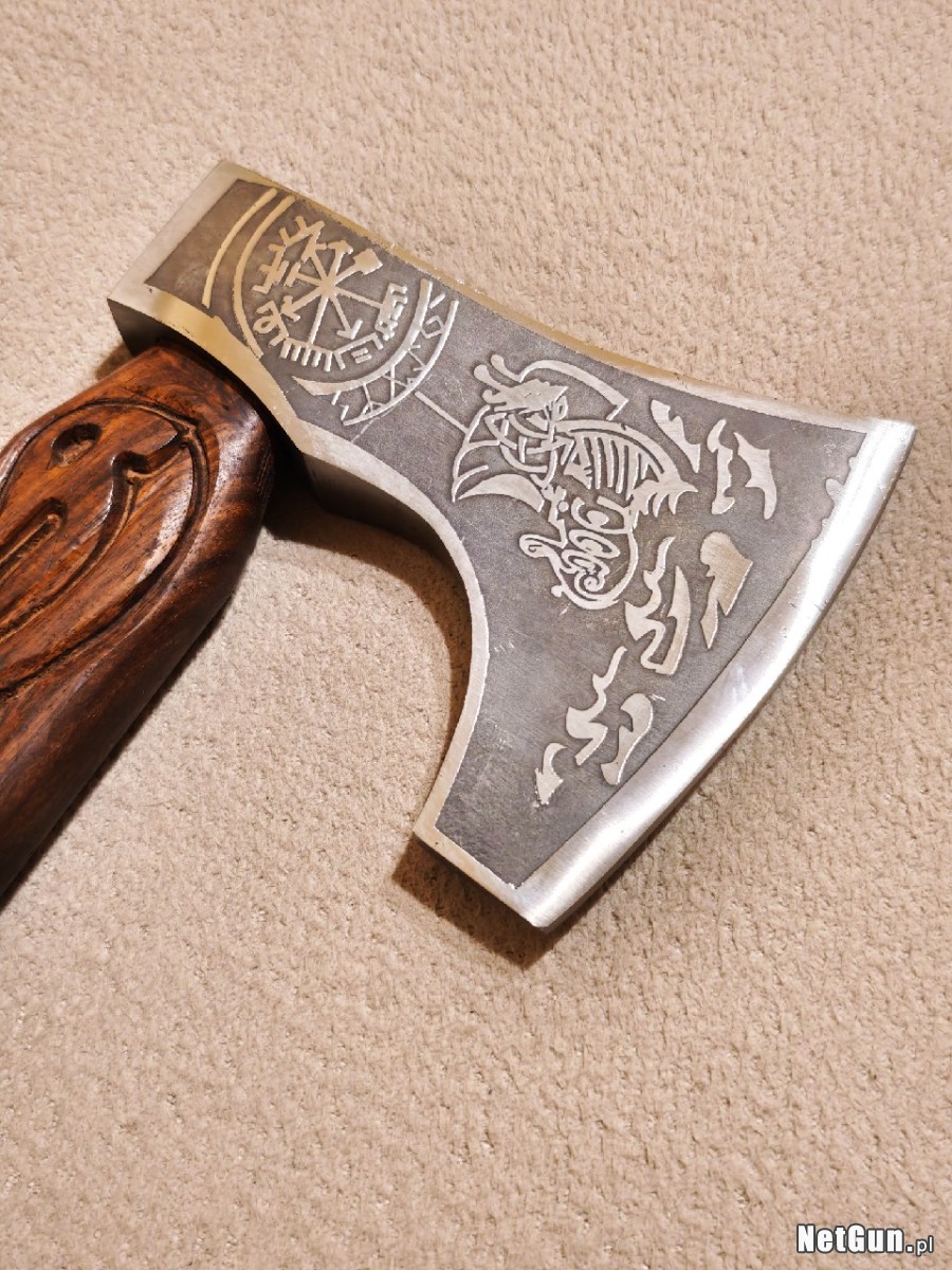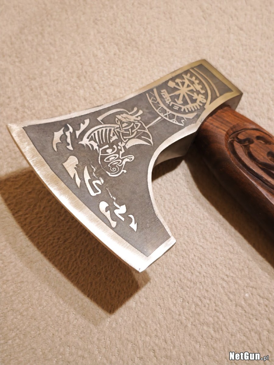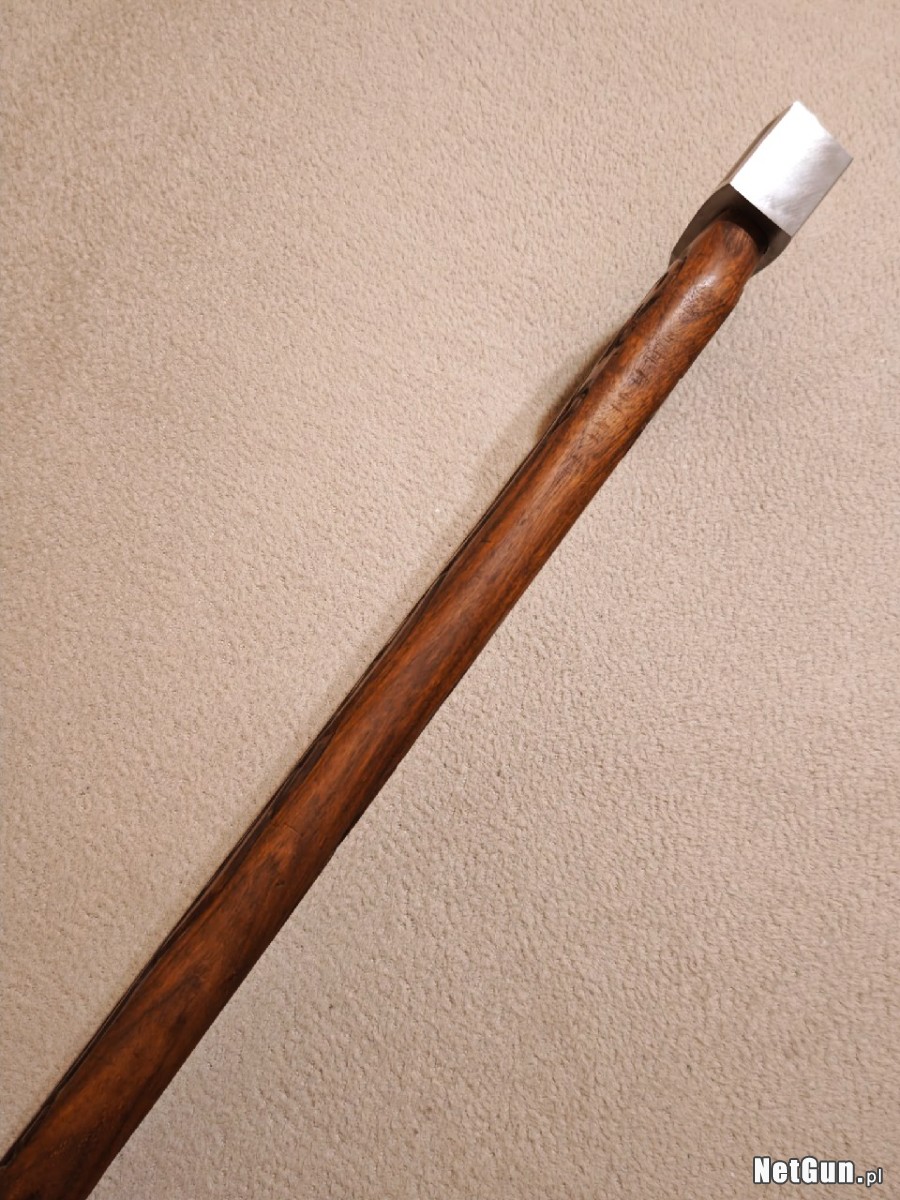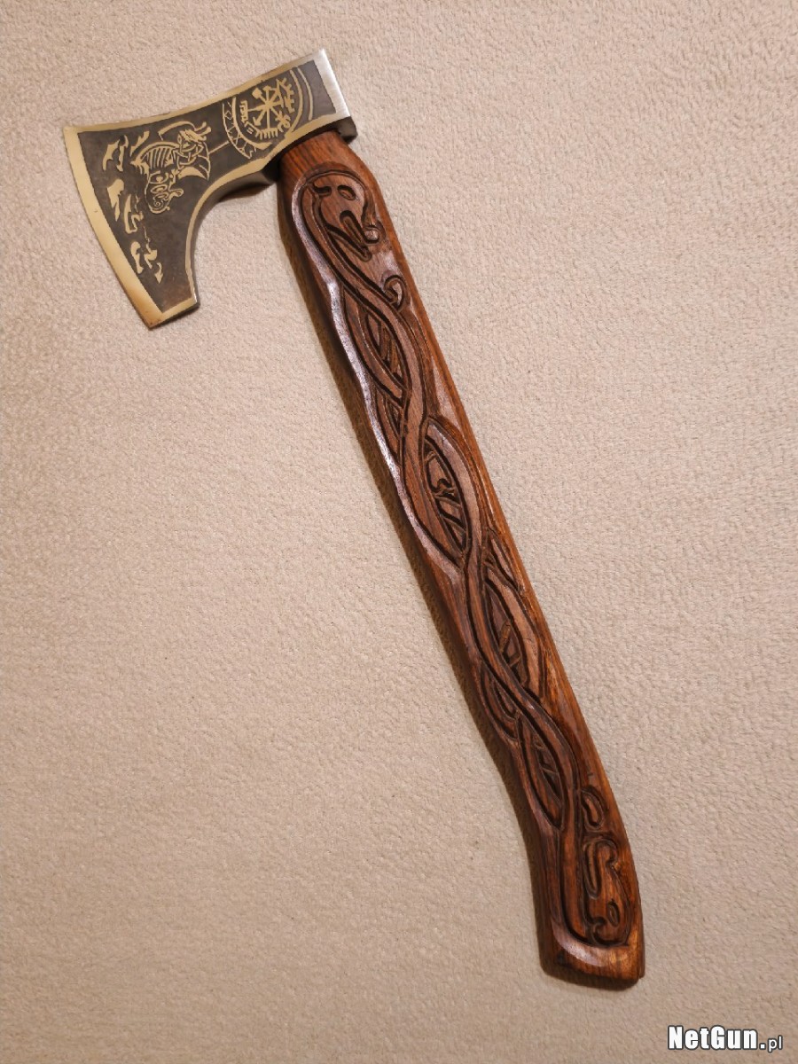 Siekiera posiada ergonomiczną rękojeść wykonaną z drewna, ręcznie rzeźbioną. Która ma właściwości antypoślizgowe.