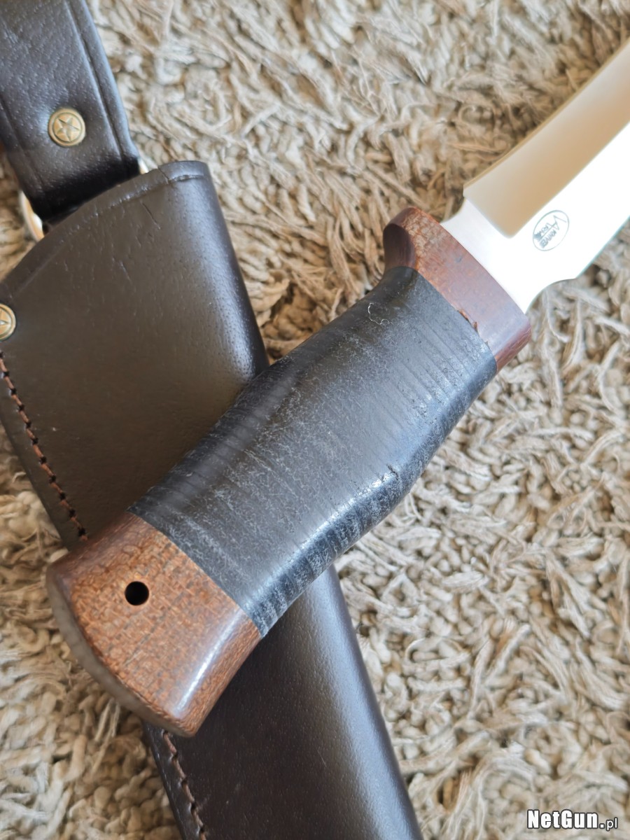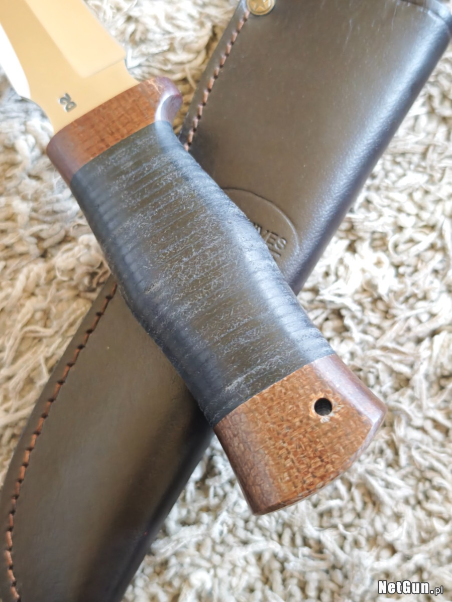 Wygodna rękojeść została wykonana ze sprasowanej skóry i mikarty. Dobrze wpasowuje się w dłoń podczas pewnego, mocnego chwytu. Na końcu otwór na rzemien, linke.