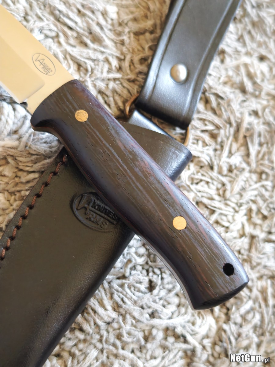Rękojeść została wykonana z drewna Wenge, na końcu otwór pod linkę, rzemień..