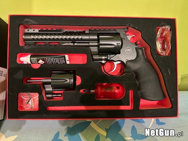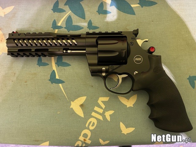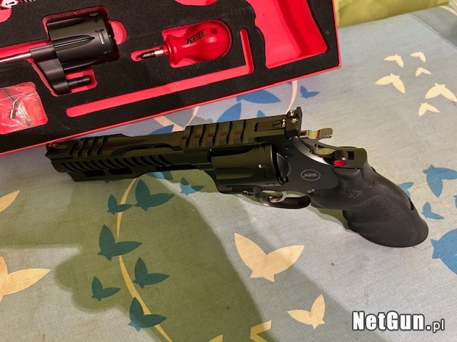 Na sprzedaż rewolwer Korth NXS 6'' z dwoma bębnami 8 nabojowymi jeden cal. .38/357 drugi 9mm, cały zestaw na jedną promesę. Przelot .38 ok. 200 kulek, 9mm ok. 20 kulek, nie strzelałem z .357. Rewolwer jak nowy, kupiony w październiku zeszłego roku w RP Arms. Dodatkowo dodaje dedykowany kompensator, obciążenie i gumowy uchwyt firmy Hogue. Sprzedaje kpl ze zdjęć w tym po 5 moon clipsów do .38/357 i 9mm.