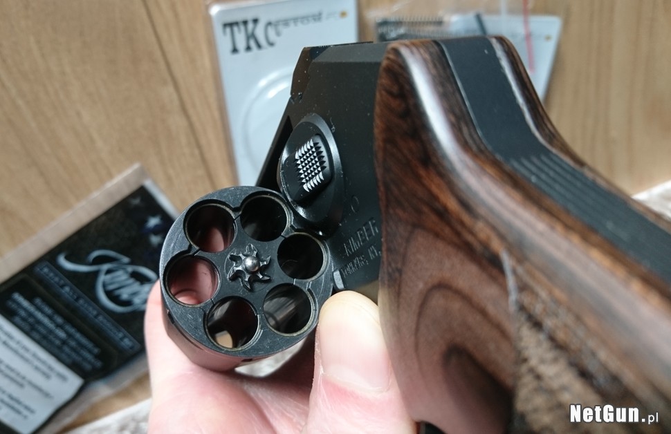 Zalety trzonowe: niska waga przy 6-cio komorowy bębnie; metalowe / trytowe przyrządy celownicze;, dwuetapowy i ukryty mechanizm naciągu kurka o wyśmienitej wadze.