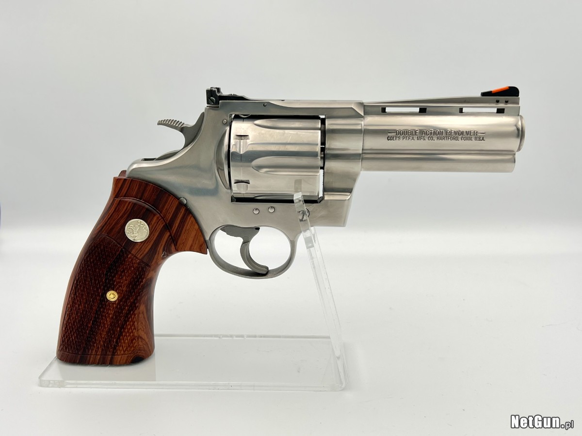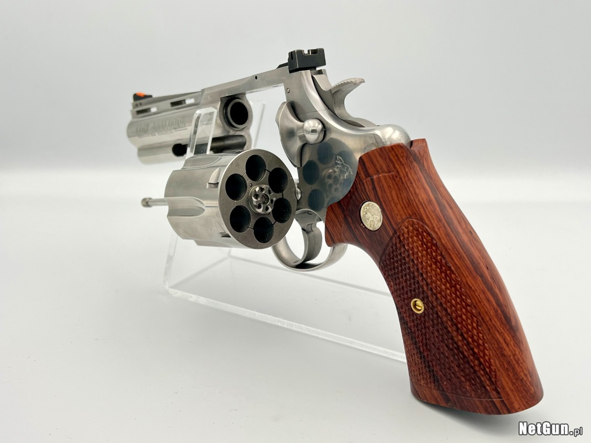 Egzemplarz w bardzo dobrym stanie, idealny zarówno dla kolekcjonera, jak i miłośnika klasycznej broni rewolwerowej. Rewolwer stanowi jeden z kilku składających się na rodzinę węży Colta. Zestaw zawiera: oryginalny kuferek producenta, fabryczne gumowe okładziny, komplet drewnianych okładzin, broń w pełni sprawna, zadbana, lufa lustro, fabrycznie przygotowany pod montaż szyny pod optykę. Kaliber: .44 magnum.